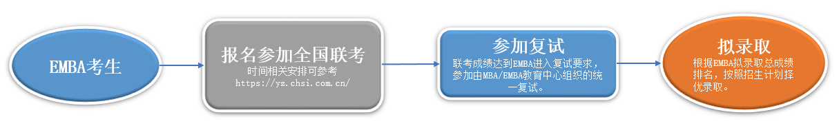 (二)报考流程:考生登录中国研究生招生信息网,填写报名山东大学EMBA→联考成绩达到我校EMBA复试要求,参加MBA/EMBA教育中心组织的统一复试→根据EMBA拟录取总成绩排名按照招生计划择优录取。